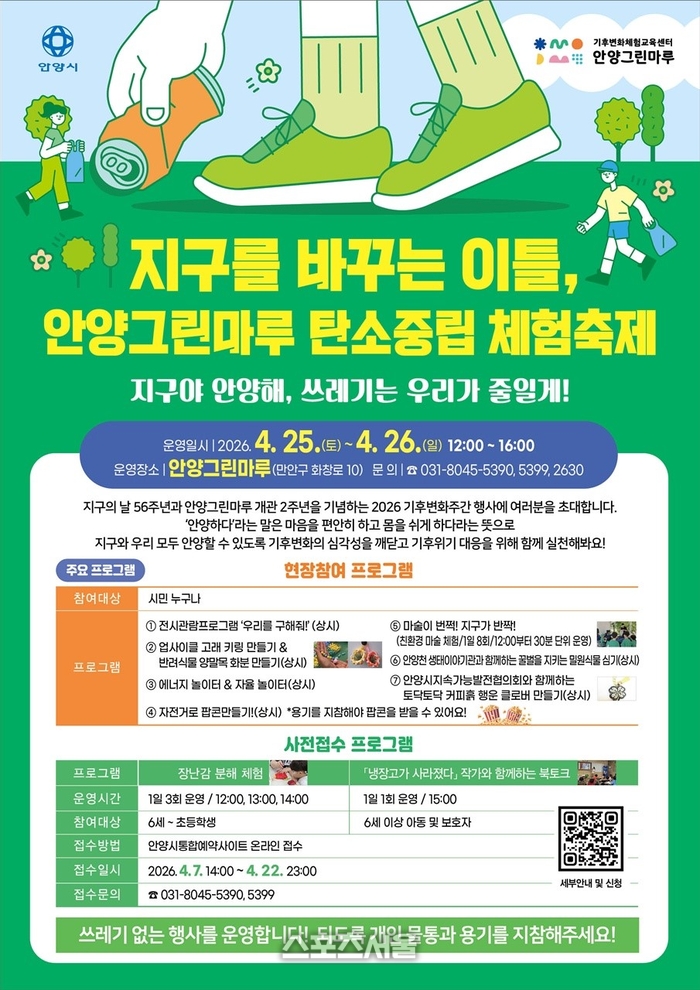 이와 함께 오는 25일부터 26일까지 안양그린마루에서 ‘지구를 바꾸는 이틀, 안양그린마루 탄소중립 체험 축제’를 진행한다.