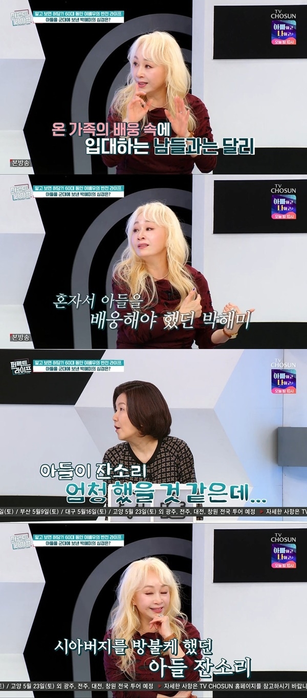 지난 22일 방송된 TV조선 ‘퍼펙트라이프’에서 박해미는 아들의 입대 후대 후 심경을 묻는 말에 “신난다”는 의외의 답변을 내놔 주변을 놀라게 했다.