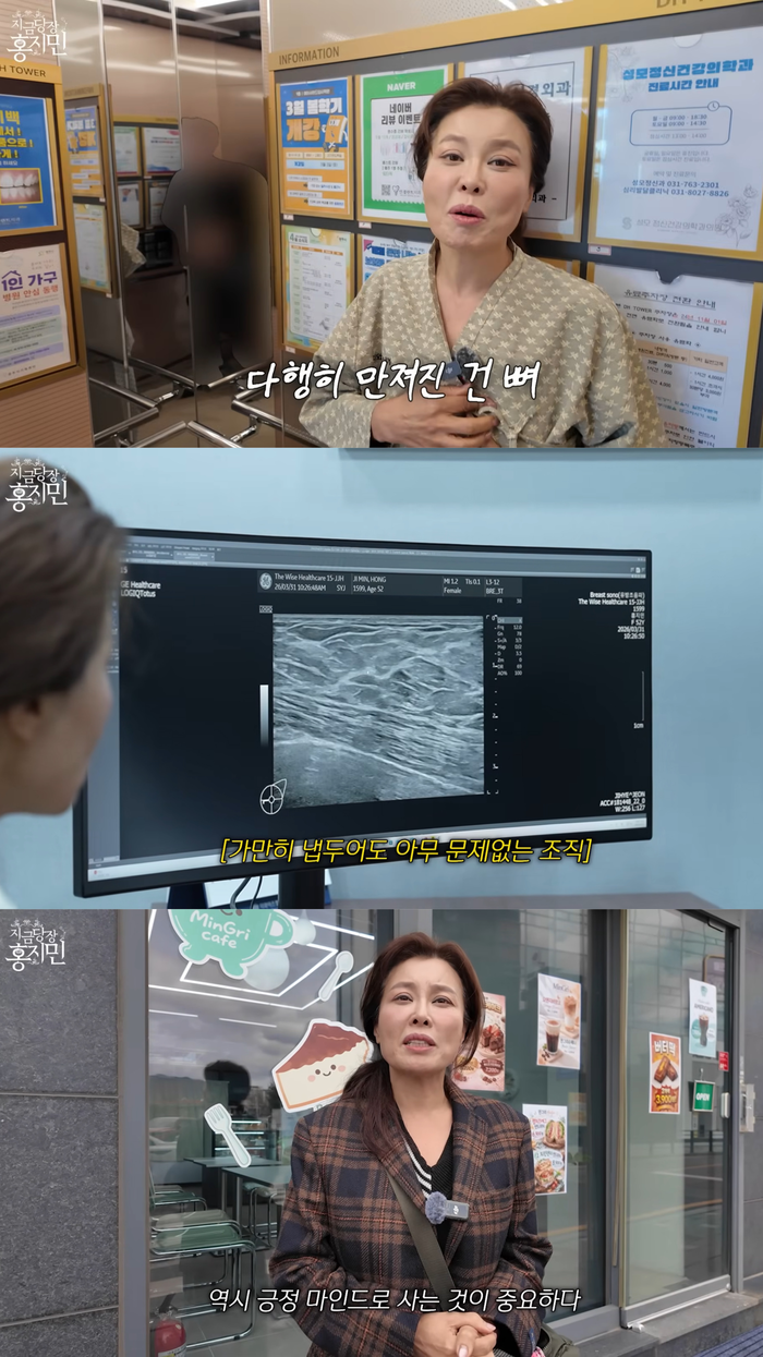 유방 초음파 검사를 진행한 홍지민은 “작년에는 없던 딱딱한게 만져져서 순간 긴장했다”며 “다행히 이상은 없었다. 살이 빠지면서 뼈가 만져진 거라고 하더라”라고 설명했다.
