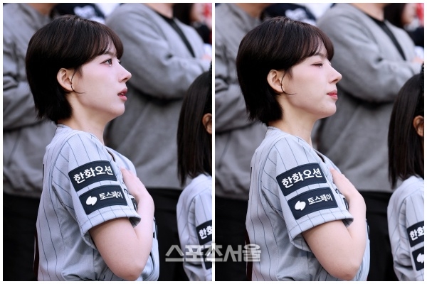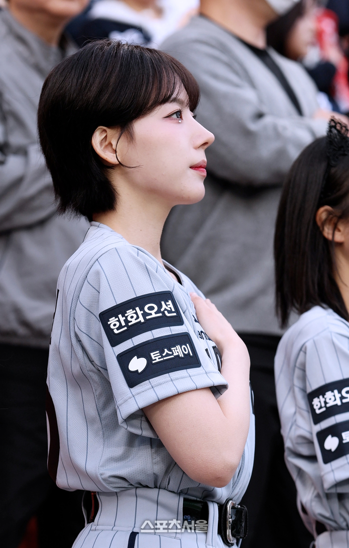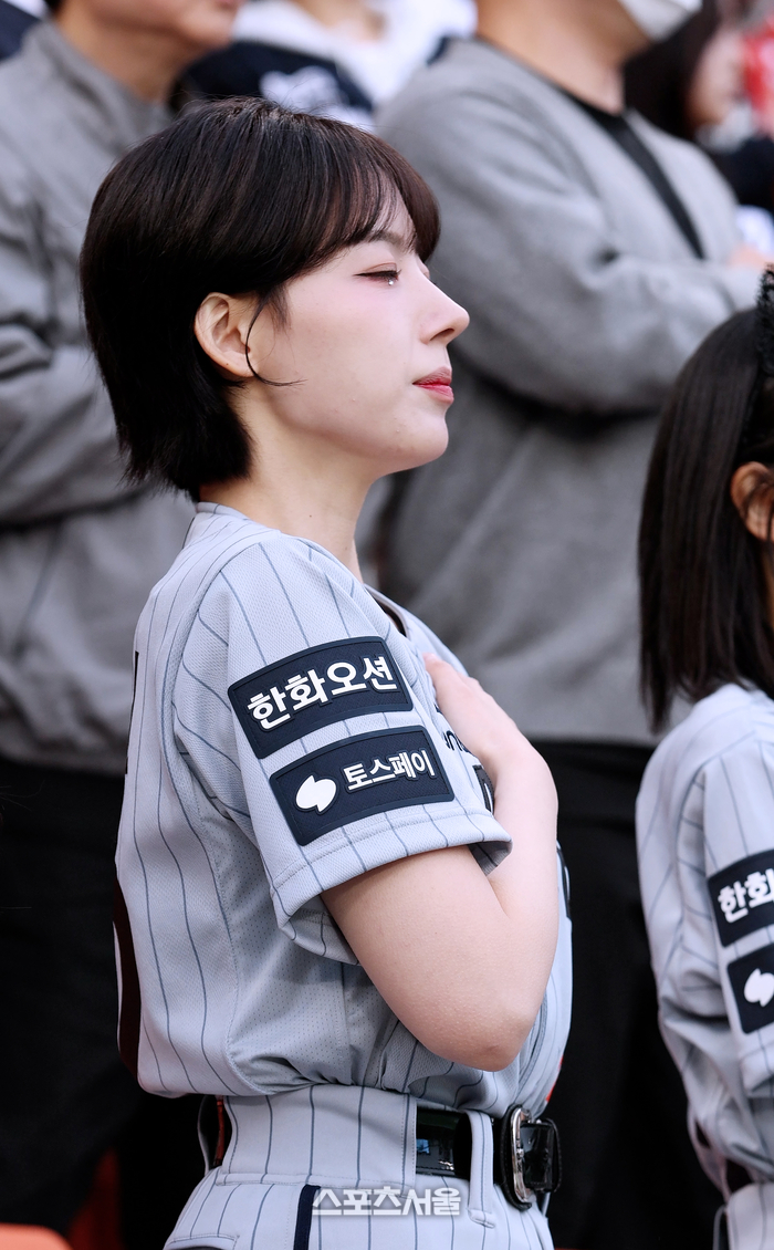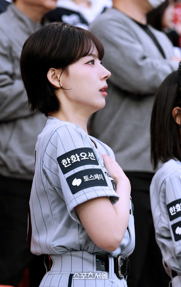 ‘2026 프로야구’ LG 트윈스와 한화 이글스의 경기에서 이글스 치어리더 하지원이 기침을 참아가며 꼿꼿한 자세의 애국가 예절을 지키고 있다. 이날 심한 일교차로인해 오후엔 쌀쌀한 기온이 감지됐다.