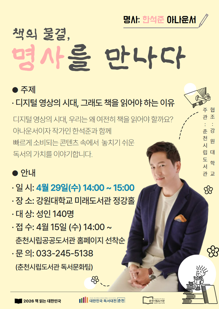 이어 29일 오후 2시에는 강원대 미래도서관 정강홀에서 ‘책의 물결, 명사를 만나다’라는 명사특강이 진행된다. 첫 강연에는 아나운서 출신 작가 한석준이 참여해 독서를 주제로 한 인문학 강연을 펼친다. 명사특강은 4월을 시작으로 5월 최재천·나태주, 7월 고명환 작가까지 릴레이 형식으로 이어질 예정이다.