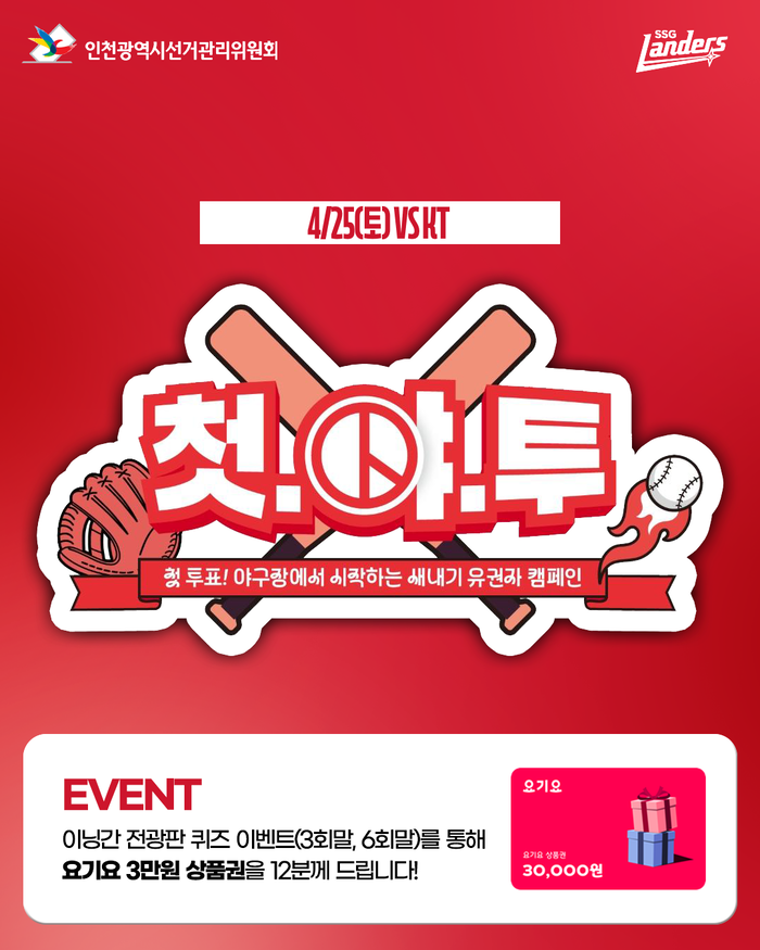 SSG는 “이번 행사는 인천시 선거관리위원회와의 협업을 통해 지역 사회에 이바지하고, 야구장을 찾은 팬들에게 투표의 중요성을 자연스럽게 알리는 뜻깊은 기회가 될 것”이라고 전했다. sshong@sportsseoul.com