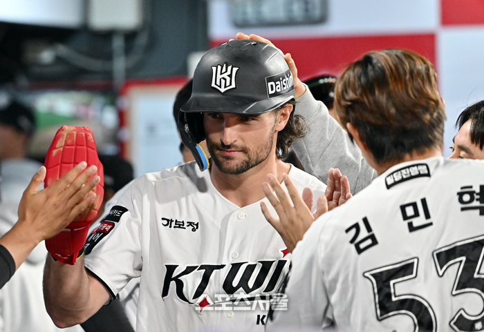 KT 힐리어드가 23일 수원 KT위즈파크에서 열린 2026 KBO리그 KIA와 경기 6회말 2사 3루 KIA 홍민규의 폭투에 3루에서 홈으로 파고들어 득점을 한 뒤 동료들과 하이파이브를 하고 있다. 2026. 4. 23.