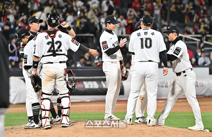 KT 선수들이 23일 수원 KT위즈파크에서 열린 2026 KBO리그 KIA와 경기에서 8-3으로 승리하며 3연승을 기록한 뒤 하이파이브를 나누고 있다. 2026. 4. 23.
