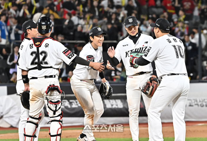 KT 선수들이 23일 수원 KT위즈파크에서 열린 2026 KBO리그 KIA와 경기에서 8-3으로 승리하며 3연승을 기록한 뒤 하이파이브를 나누고 있다. 2026. 4. 23.