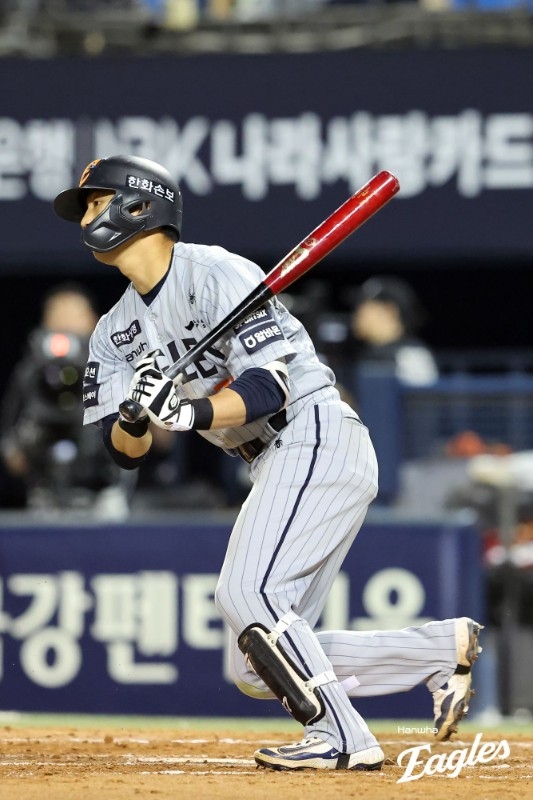 5회초 한 점을 더 달아났다. 이번에도 홈런이다. 문현빈이 다소 높게 제구된 김진성의 시속 141㎞ 속구를 잡아당겼다. 우측 담장을 향해 타구가 쭉쭉 뻗아갔다. 4-2를 만드는 솔로 홈런이다.