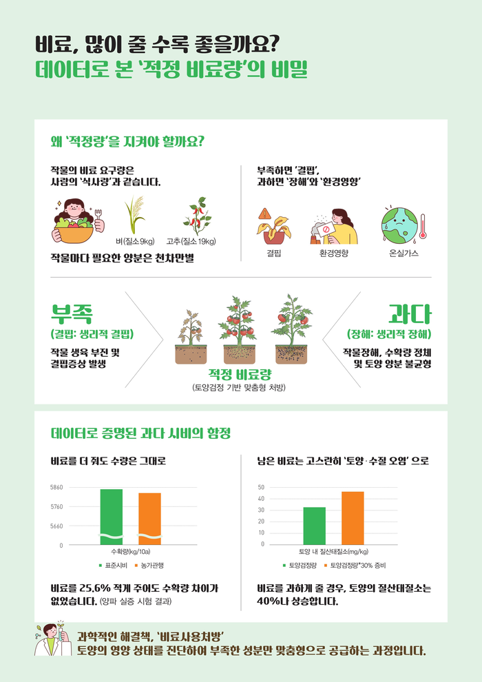 비료를 과다하게 사용할 경우 작물이 흡수하지 못한 양분이 토양에 축적되거나 유실돼 비용 부담이 증가할 뿐 아니라, 토양 산성화와 염류집적 등 재배 환경 악화로 이어질 수 있다. 반면 토양검정 후 처방서에 따라 시비하면 작물 생육에 필요한 양분을 적기에 공급할 수 있어 수량 안정과 품질 향상에도 도움이 된다.