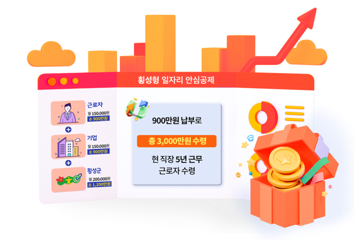 이 사업은 본인 납부금의 3배가 넘는 수령액을 보장하는 횡성군 맞춤형 고용 안정 프로젝트다. 적립 구조를 보면 근로자가 매월 15만 원을 부담할 경우 기업이 15만 원, 횡성군이 20만 원을 각각 매칭 지원한다. 이를 통해 매달 50만 원씩 5년간 적립하면 만기 시 총 3,000만 원과 이자를 수령하게 된다.