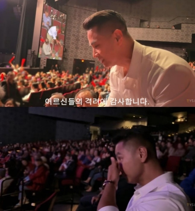 이날 무대 위 태진아는 “LA에 살고 있는 가수 유승준이 왔다”며 그를 직접 소개했다. 이에 유승준은 자리에서 일어나 관중석을 향해 90도로 고개 숙여 인사했다.