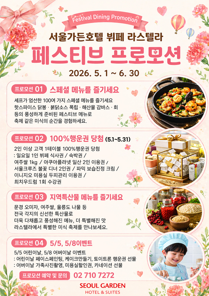 [스포츠서울 | 위수정 기자] 서울가든호텔이 가정의 달을 맞아 5월 1일부터 6월 30일까지 뷔페 레스토랑 라스텔라에서 ‘페스티브 프로모션’을 진행한다.