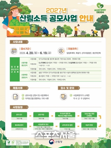 군에 따르면 임산물 생산,가공, 유통을 아우르는 복합 산업 구조 전환을 목표로‘2027년도 산림소득사업(임산물생산단지 규모화)’ 공모사업 신청을 오는 6월 19일까지 접수한다고 밝혔다.