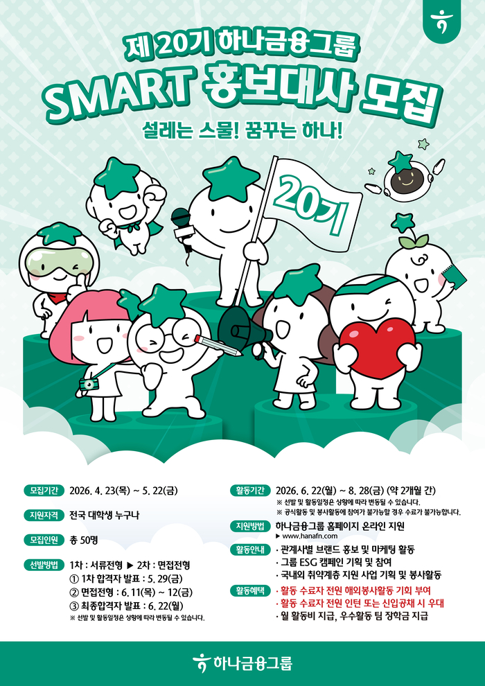 [스포츠서울 | 조선경 기자] 하나금융그룹이 오는 5월 22일까지 ‘제20기 하나금융그룹 스마트 홍보대사(이하 스마홍)’을 모집한다.