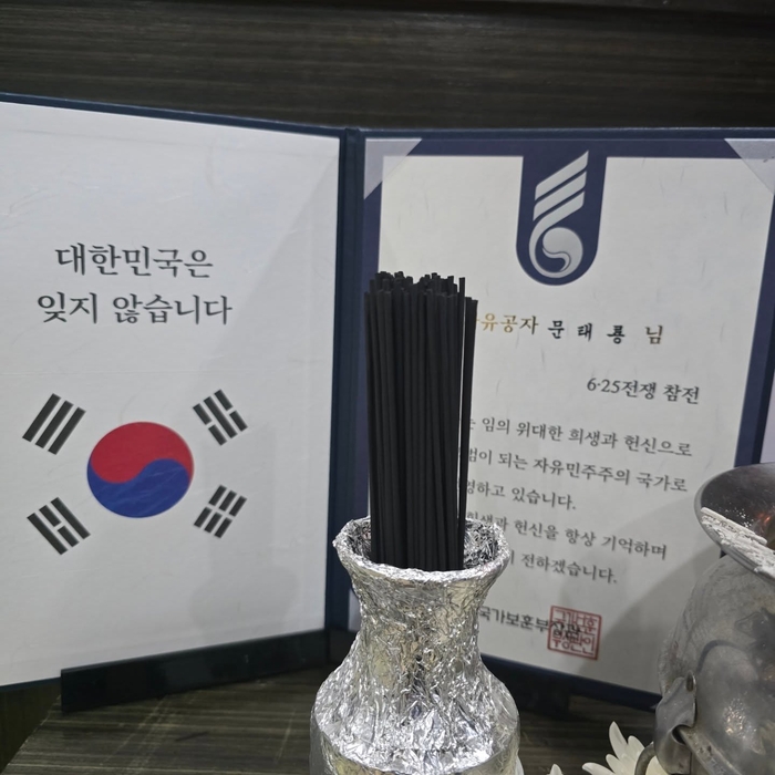 공개된 사진 속에는 생전 6.25 참전 기념 모자를 쓰고 계신 고인의 생전 모습과 국가보훈부에서 전달한 “대한민국은 잊지 않겠습니다”라는 문구가 담긴 증서가 놓여 있어 보는 이들의 가슴을 뭉클하게 했다.