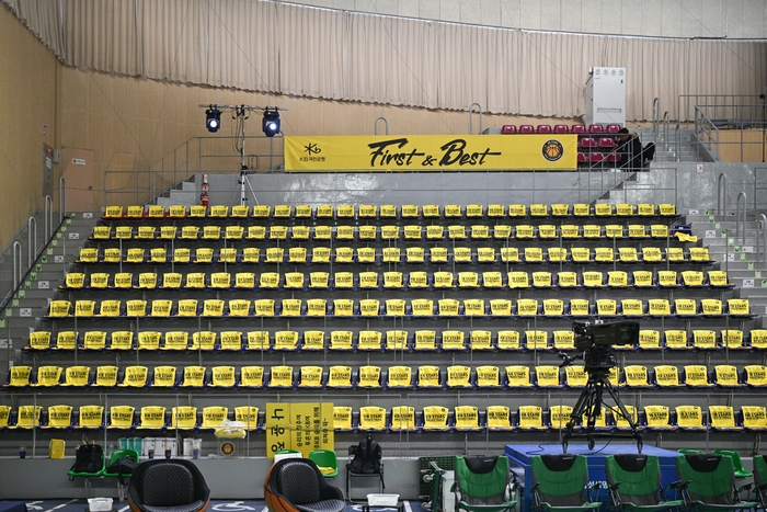 마침내 팬들이 입장을 시작했다. 가장 눈에 띄는 구역은 KB 원정 팬들이 모인 자리다. 경기 전 노란색 티셔츠가 의자마다 놓여있었다. 경기장에 들어온 KB 팬들은 모두 이 노란 티셔츠로 갈아입었다. 그리고 노란 막대풍선을 두들기면서 경기 전부터 홈 팬들에 밀리지 않는 응원 열기를 보냈다.