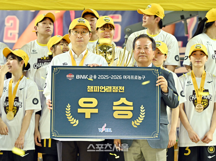 KB스타즈 김완수 감독(왼쪽)이 26일 용인실내체육관에서 열린 2025-2026 여자프로농구 삼성생명과의 챔피언결정전 3차전에서 삼성생명에 승리하며 3연승으로 통합 우승을 차지한 뒤 WKBL 신상훈 총재와 기념촬영을 하고 있다. 2026. 4. 26.