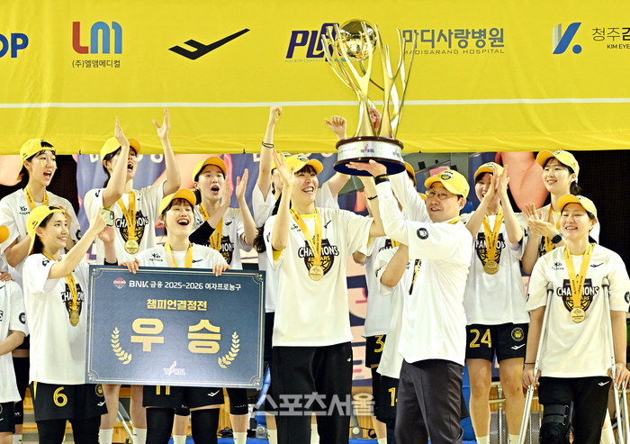 KB스타즈 김완수 감독이 26일 용인실내체육관에서 열린 2025-2026 여자프로농구 삼성생명과의 챔피언결정전 3차전에서 삼성생명에 승리하며 3연승으로 통합 우승을 차지한 뒤 주장 박지수로부터 건네 받은 트로피를 들어올리고 있다. 2026. 4. 26.