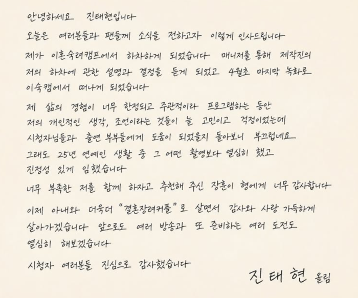 진태현은 28일 자신의 SNS를 통해 자필 편지를 게재하며 하차 소식을 공식화했다. 그는 “아직 방송 분량이 많이 남았지만, 기사를 통해 먼저 소식을 접하신 팬들에게 직접 인사드리고 싶었다”고 입을 열었다.