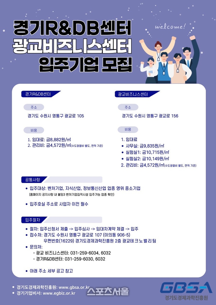 〔스포츠서울│수원=좌승훈기자〕경기도경제과학진흥원은 수원 광교테크노밸리 내 경기R&DB센터와 인근 광교비즈니스센터에 입주할 유망 벤처·중소기업을 모집한다.