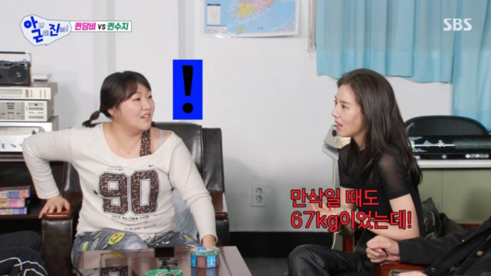 이수지가 손담비의 가녀린 몸매를 지적하자 손담비는 “싱글일 때보다 지금이 더 말랐다”고 밝혔다. 그는 “원래는 건강미 있는 체형이었는데 아이를 낳고 나서 모든 게 쪼그라든 느낌”이라고 했다. 구체적인 수치도 공개했다. 손담비는 “리즈 시절엔 50kg 정도였는데 지금은 46kg 정도”라며 “만삭 때 67kg까지 늘었다가 이후 21kg이 빠졌다”고 설명했다.