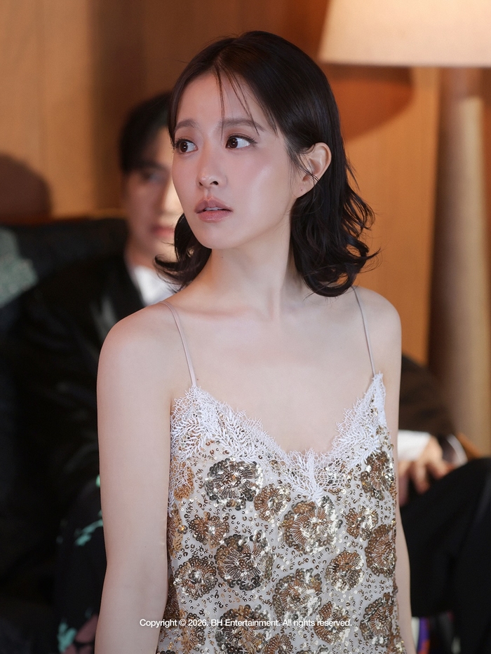 박보영은 어깨라인을 드러낸 화이트 드레스와 화려한 스팽글 의상을 완벽하게 소화하며 독보적인 자태를 뽐냈다. 내추럴한 웨이브 단발은 그의 뚜렷한 이목구비를 더욱 강조했으며, 조명 아래 깊은 눈빛은 고혹적인 무드를 자아냈다. 특히 핑크 가디건을 매치한 야외 컷에서는 청순한 매력까지 과시하며 다채로운 스타일을 선보였다.