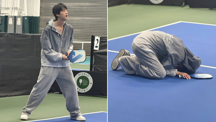 사진 속 진은 회색 트레이닝 셋업을 입고 진지한 태도로 경기에 임하는가 하면, 경기가 마음대로 풀리지 않는 듯 코트 위에 엎드려 아쉬움을 표현하는 인간적인 면모를 보였다.