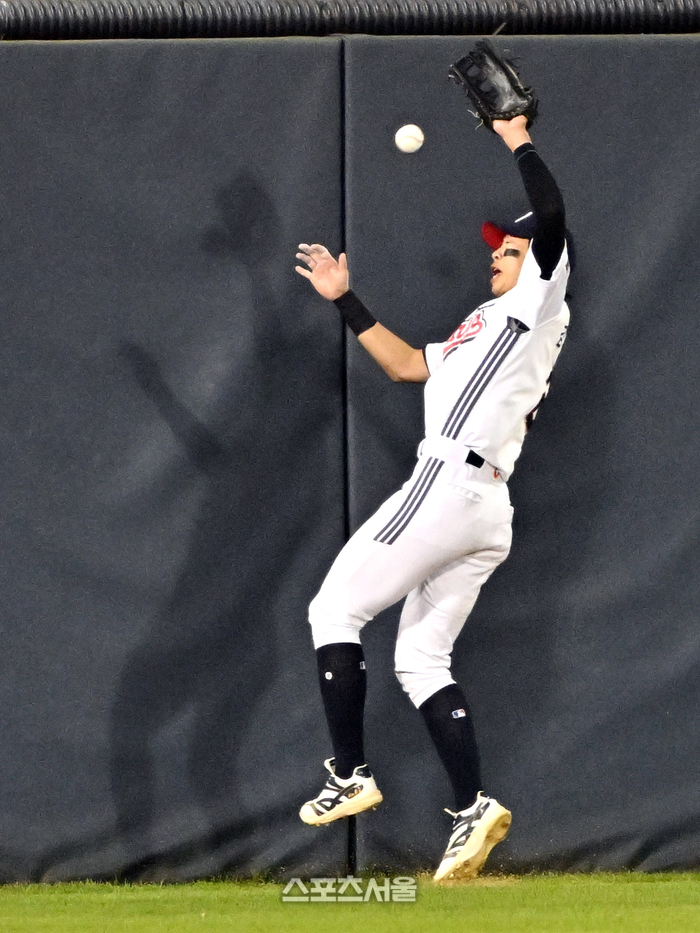 두산 좌익수 김민석이 28일 잠실구장에서 열린 2026 KBO리그 삼성과의 경기 5회초 2사 1루 상황에서 삼성 김성윤의 타구를 잡으려다 펜스에 부딪히고 있다. 2026. 4. 28.