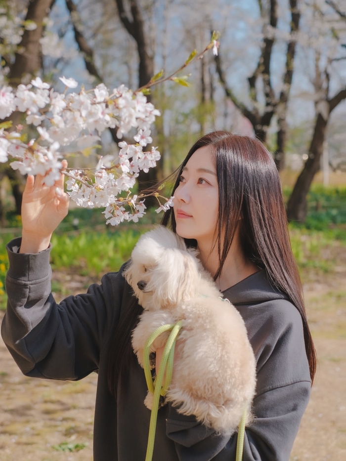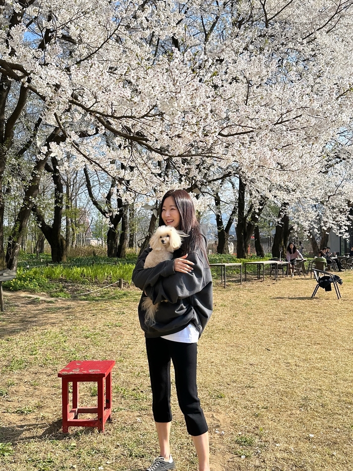 공개된 사진 속 김사랑은 흐드러지게 핀 벚꽃 아래에서 반려견을 품에 안고 여유로운 시간을 보내고 있는 모습이다.