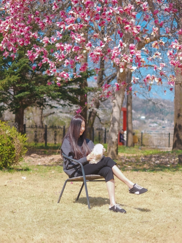 현장에서 촬영된 사진들은 마치 화보의 한 장면을 연상케 한다. 벚꽃 가지를 지긋이 바라보거나 반려견을 보며 환하게 웃음 짓는 모습에서 따뜻한 일상의 온기가 느껴진다. 또한 분홍빛 목련 나무 아래 의자에 앉아 휴식을 취하는 모습은 자연과 어우러져 평온한 분위기를 자아낸다.