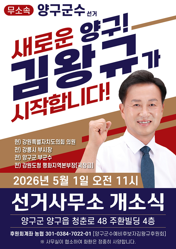 [스포츠서울ㅣ김기원 기자]김왕규 무소속 양구군수 예비후보가 오는 5월 1일(금) 오전 11시 양구읍 청춘로 48 주환빌딩 4층에서 ‘새로운 양구! 김왕규가 시작합니다!’를 슬로건으로 내걸고 선거사무소 개소식을 개최한다.