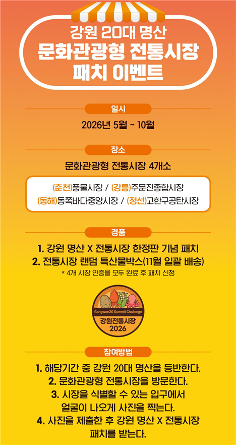 강원관광재단(대표이사 최성현, 이하 재단)은 강원지방중소벤처기업청(청장 서종필), 소상공인시장진흥공단 강원지역본부(본부장 백순임)와 ‘강원 20대 명산 인증챌린지’와 문화관광형 전통시장을 포함한 도내 64개소 전통시장 일원에서 다양한 연계 이벤트를 5월부터 10월까지 추진한다고 29일(수) 밝혔다.
