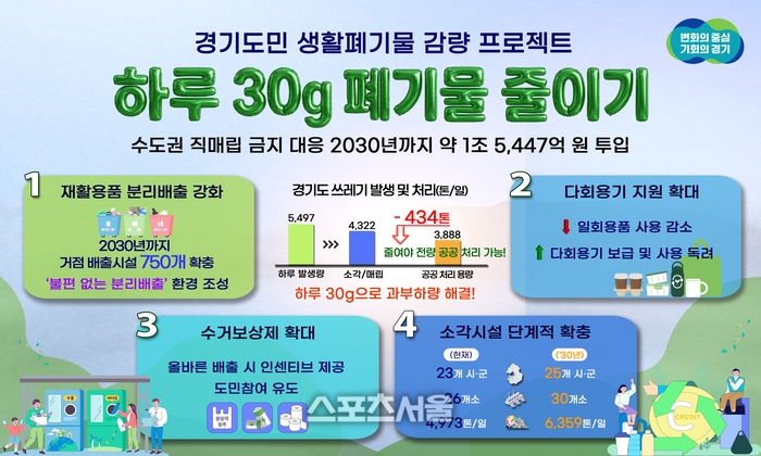 〔스포츠서울│수원=좌승훈기자〕경기도는 수도권 직매립 금지에 따른 생활쓰레기 감량을 위해 오는 2030년까지 5년간 약 1조 5447억 원을 투입하는 ‘하루 30g, 도민실천형 생활폐기물 감량 프로젝트’를 추진한다고 28일 밝혔다.