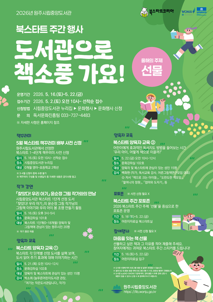 시립중앙도서관은 오는 5월 16일~22일까지 2026 북스타트 주간 행사 ‘도서관으로 책소풍 가요!’를 운영한다고 30일(목) 밝혔다.
