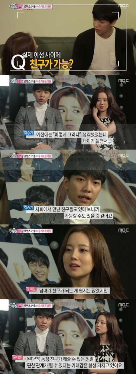 이승기는 "이성 사이에 친구가 가능한 것 같느냐"는 질문에 "예전에는 '어떻게 그럴 수 있을까' 생각했었는데 나이도 들고 사회에 나와 만난 친구들도 있다 보니까 가능할 수도 있을 것 같다"고 답했다.
