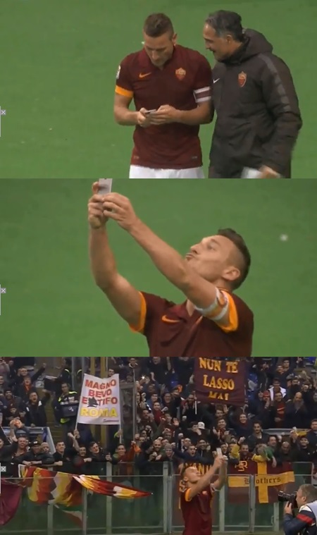 골을 터뜨린 토티는 경기장 광고판을 넘어 홈팬들 앞으로 달려가 어퍼컷 세리머니로 기쁨을 표현했다. 토니의 세리머니는 여기서 멈추지 않았다. 구단 관계자에게 휴대전화를 받은 뒤 엄지손가락을 치켜세우며 '따봉 셀카'를 찍은 것.
