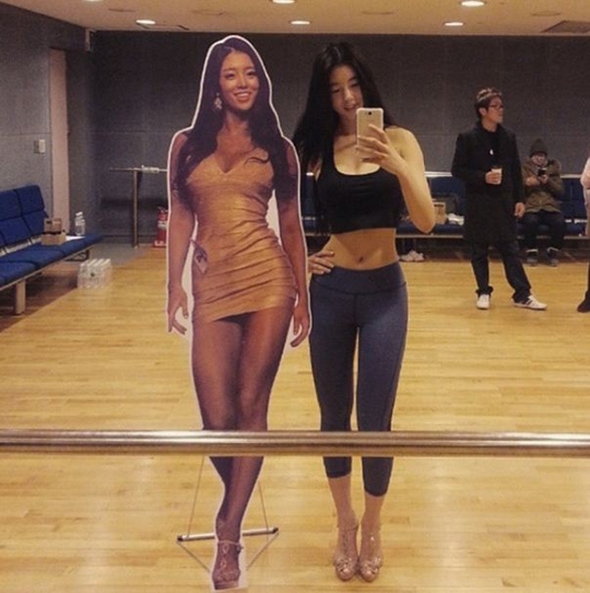 당시 공개된 사진 속에는 본인의 판넬과 함께 포즈를 취하고 있는 유승옥의 모습이 담겼다. 판넬에 프린트된 사진보다도 우월한 여신 미모가 인상적이다. 군살 없는 허리 라인이 눈에 띈다.