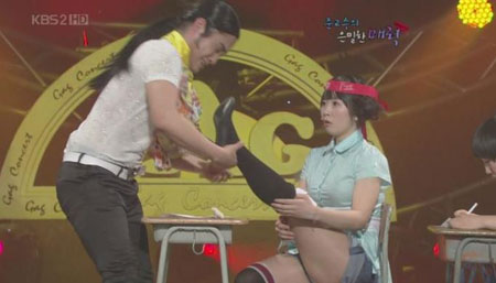 사진 속에는 과거 KBS 2TV '개그콘서트'의 코너 '준교수의 은맬한 매력'에 출연한 허미영의 모습이 담겼다. 특히 연기 도중 송준근이 허미영의 다리를 들어 올렸고, 이어 허미영의 적나라한 허벅지가 노출되는 장면이 포착돼 굴욕을 안겼다.
