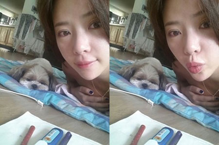 공개된 사진 속 황정음은 애견과 함께 바닥에 엎드려 카메라를 응시하고 있다. 특히 황정음은 손으로 가슴을 가린 채 엎드려 있어 마치 아무것도 걸치지 않은 듯한 느낌을 연출했다.