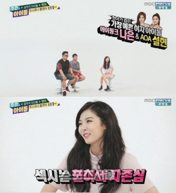 이날 방송에서 "가장 예쁜 아이돌과 섹시한 아이돌을 꼽아달라"는 팬의 질문을 받은 현아는 잠시 고민하다 "에이핑크 손나은과 AOA 설현이 예쁜 것 같다"고 답했다.