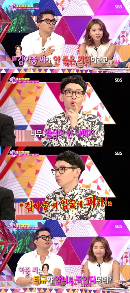 이날 방송에 함께 출연한 정준은 봉태규에게 "예전에 김아중과 키스신을 찍지 않았나? 내가 김아중에게 듣기로는 '그때 봉태규가 너무 적극적이어서 기억이 좋지 못 하다'고 하더라"고 말했다.