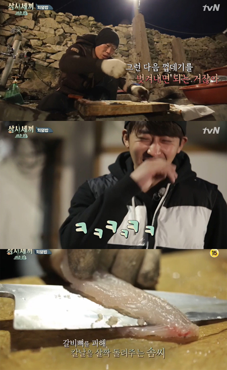 처음엔 생선포를 잘 못 떠 가시를 발라낼 수 없었지만, 조금씩 익숙해져 능숙한 솜씨를 뽐냈다. 유해진은 회 뜬 것을 손호준에게 맛 보여주며 미소를 띠어 눈길을 끌었다.