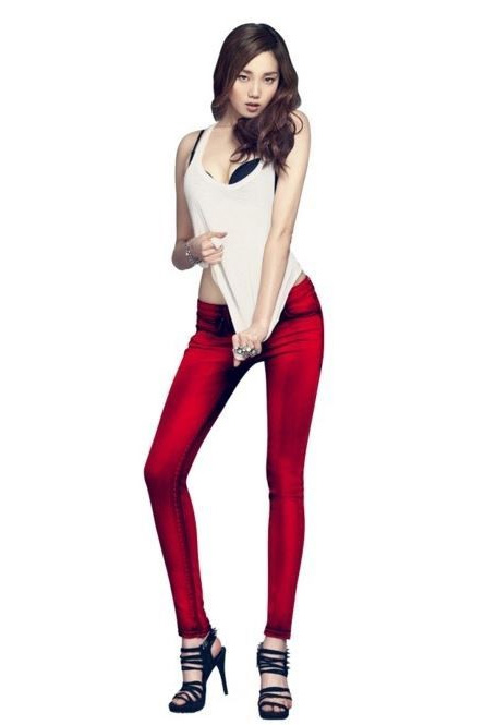 또다른 사진 속에서 이성경은 빨간색 스키니를 입고 도발적인 포즈를 취했으며, 짧은 상의 탓에 잘록한 허리 라인이 드러나 눈길을 끈다.