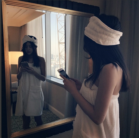 공개된 사진에는 한 호텔에서 어깨가 훤히 드러나는 흰색 수건 가운을 입은 채 핸드폰을 만지고 있는 임희정의 모습이 담겨있다. 특히 거울로 비친 임희정은 작은 얼굴과 늘씬한 각선미를 자랑해 눈길을 끌었다.