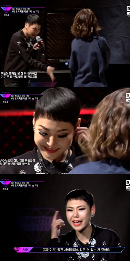 이날 치타는 '프리티 걸'을 표방하는 지민을 누르기 위해 지민 특유의 목소리를 따라하는 등 맹렬한 기세로 지민을 디스했다.