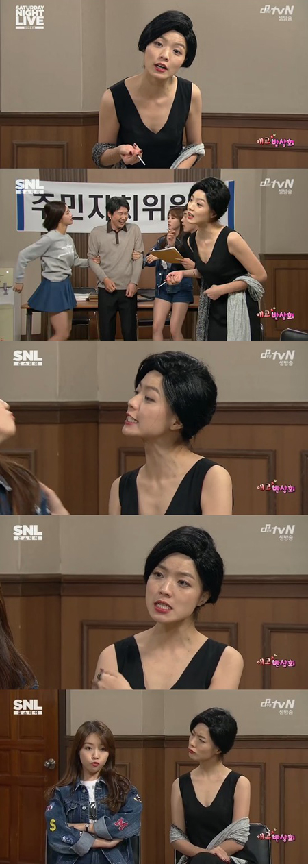 지난해 10월 11일 방송된 'SNL' 걸스데이 호스트 편 콩트 '애교 반상회'에서는 당시 배우 김부선 아파트에서 불거진 난방비 논란을 소재로 다뤘다. 과거 tvN '코미디 빅리그'에서 김부선을 흉내 낸 안부선으로 열연했던 안영미는 '애교 반상회'에서도 김부선으로 변신해 명연기를 펼쳤다. 반상회를 주최한 신동엽은 "그 놈의 난방비 때문에 아파트 주민들끼리 싸우니까 민원이 자꾸 들어오잖냐"며 주민들에 주의를 줬고 안영미는 "이건 작은 일이 아니고 큰일이야"를 연발한 뒤 "이 원피스 3만 원짜리"라고 밝혀 웃음을 자아냈다.
