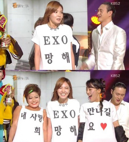 신보라의 양 옆에서 뒤돌아 서 있던 두 사람은 겉옷을 벗으며 신보라의 양 옆에 섰다. 결국 티셔츠에 프린트된 문구는 '엑소 망해'가 아닌 '내 사랑 엑소 만나길 희망해요'라는 희망적인 메시지로 바뀌어 웃음을 자아냈다.