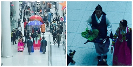 공개된 사진 속에는 단정하게 한복을 차려입은 정준하 홍진경의 모습이 담겼다. 수많은 시민들이 몰린 지하철 역사에서 전통 혼례 분위기를 연출해 눈길을 끈다. 시민들은 가던 길을 잠시 멈추고 이들의 모습을 카메라에 담고 있어 웃음을 자아낸다.