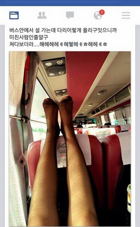공개된 사진 속 이 여성은 주위 승객들의 시선은 아랑곳하지 않은 채 고속버스 앞 좌석에 다리를 올려놓고 사진을 찍어 자신의 SNS 계정에 올렸다.