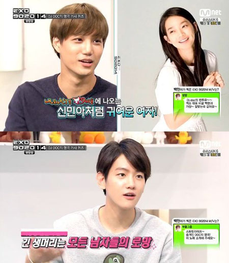 이날 세훈은 "도도한 여자를 좋아한다"고 밝혔고 카이는 "드라마 '내 여자친구는 구미호'의 신민아처럼 귀여운 여자가 좋다"고 말했다.
