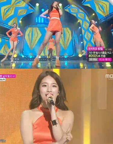 이날 방송에서 수지는 노출이 있는 오렌지빛 의상을 입고 육감적인 몸매를 뽐냈다. 수지는 멤버 중 유일하게 운동화를 신고도 굴욕없는 각선미로 시선을 끌었다. 특히 최근 배우 이민호와 열애를 인정한 수지는 점점 더 예뻐지는 미모를 자랑해 남성 팬들의 시선을 한 눈에 사로잡았다.