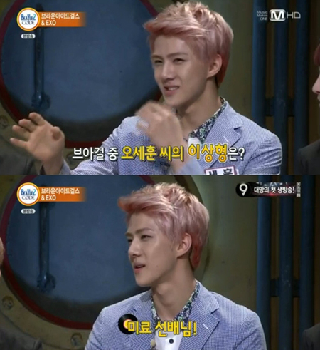 이에 MC들은 세훈에게 "브라운아이드걸스 중 이상형은 누구냐"고 물었고 세훈은 "미료 선배님이다"라고 말했다.